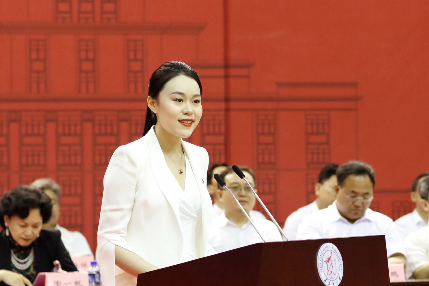 经济与工商管理学院李洋代表2019届毕业生向陪伴自己成长的母校和老师们献上最崇高的敬意。她深情地回顾了在黑大求学的美好时光,这里的每一个角落都见证了大家从求知少年走向有智青年,她表示今后无论在何时何地,都会追梦筑梦,做勇于担当的黑大人。