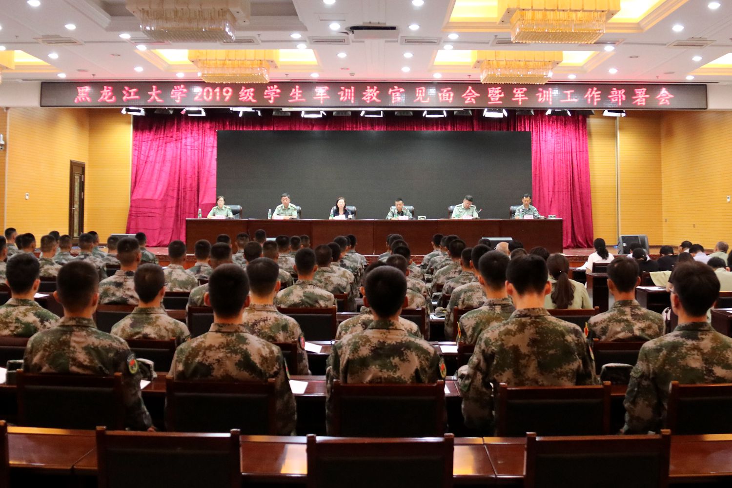 8月31日下午,我校召开2019级学生军训教官见面会暨军训工作部署会,与承训部队对接,统筹安排军训工作事宜。承训部队高级工程师张晖上校、副政治教导员胡飞鹏少校、黑龙江大学党委副书记丁宏、党委学工部部长、学生处处长、武装部部长李石、校团委书记周成刚出席会议。各学院主管学生工作领导、全体2019级学生辅导员和承训教官参加会议。会议由党委学工部副部长、学生处副处长孙丽娜主持。