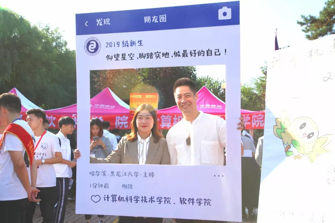 学校还特意为新生们制作了两个带有校训和校徽标识的拍照打卡地。印有“2019新同学”“为你打call”“黑龙江大学”“博学慎思参天尽物”等字样的拍照背景板和手持标语深受学生喜欢,大家纷纷在这里留下纪念照。