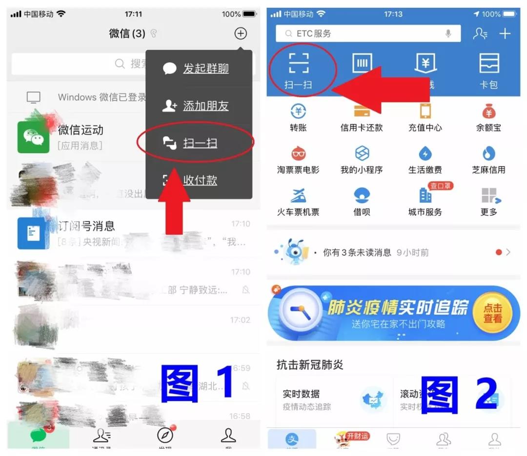 步骤一、扫码。使用微信或支付宝扫一扫功能扫描通知中的二维码即可,如图1和图2所示。
