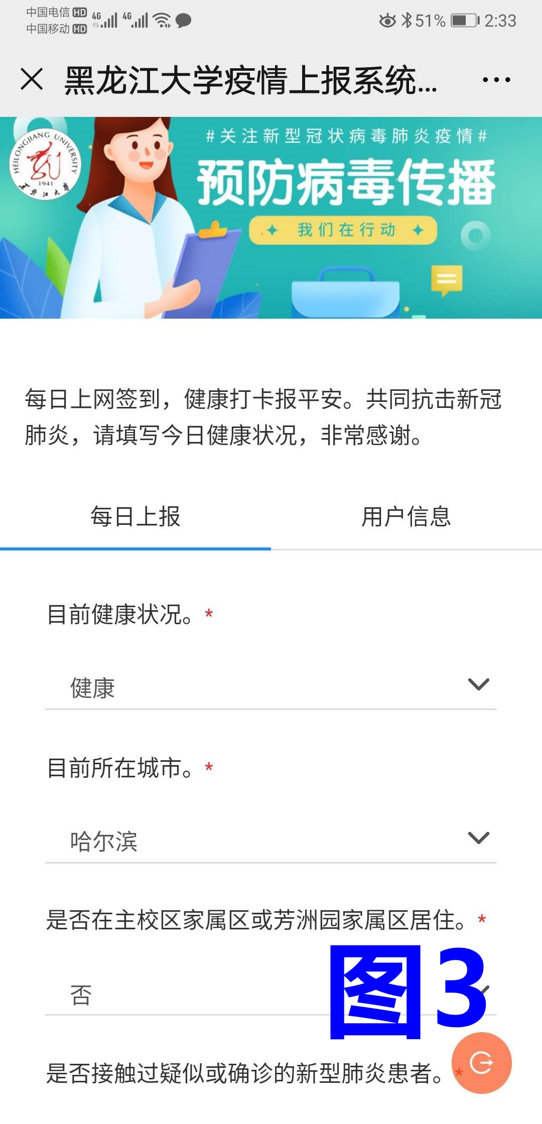 步骤二、每日填报信息。在出现页面中填报信息后确定提交即可,图3所示。