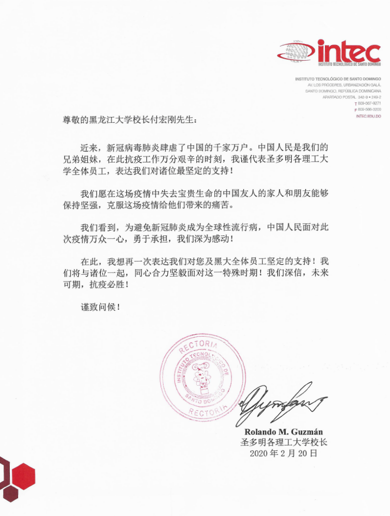 日前,多米尼加圣多明各理工大学校长Rolando M.Guzmàn先生给黑龙江大学校长付宏刚发来慰问信,表达对全校师生的最坚定的支持和最深情的问候。