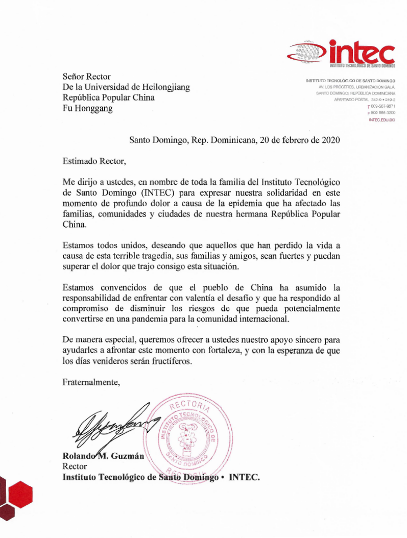 近来,新冠病毒肺炎肆虐了中国的千家万户。中国人民是我们的兄弟姐妹,在此抗击疫情工作万分艰辛的时刻,我谨代表圣多明各理工大学全体员工,表达我们对诸位最坚定的支持!