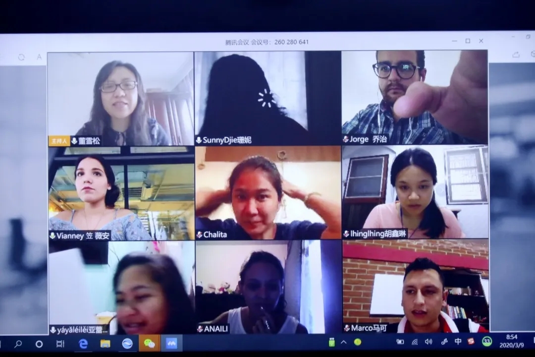 最为引人注目的是国际文化教育学院董雪松老师给留学生开设的《初级汉语》课程,不同肤色不同国家的留学生们,更是克服了时差等困难因素,如约地坐在了屏幕面前,师生们在互问安康之后,开始了课程的讲授,严谨认真的课堂讲授赢得了在场人员的频频点赞!
