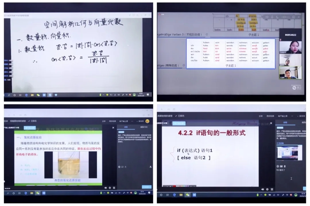 教务处处长吴华洋拿出了上午的课程列表,并按照提前统计好的登录方式进入课堂。他带着大家通过“钉钉”软件,“走进”了数学科学学院赵治涛老师的《高等数学》课程课堂,师生们在网络上早已集结完毕,老师通过在演算纸上手写的方式向学生们讲述解题的推演过程,课程中信号稳定、画面清晰,令大家倍感欣慰。在西语学院贵琳老师的《基础德语》课程课上,老师在为学生们认真地做发音示范,逐个地让学生们进行跟读训练,不时地纠正学生的发音错误,并耐心地讲解发音的技巧。在化学化工与材料学院任志宇的《物理化学B(上)》线上课堂中,老师正在播放PPT,并通过视频的方式演示实验的操作过程,向学生们讲解实验要领。
