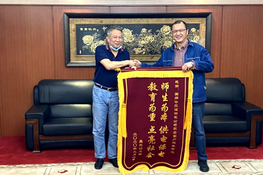 为表示对国网哈尔滨供电公司全力支持和协助我校抢修丽泽园变电所公寓线故障的衷心感谢,9月14日下午,校长付宏刚,学校办公室、校区管理处、后勤管理处等相关部门负责人一行赴国网哈尔滨供电公司,赠送锦旗并开展座谈。国网哈尔滨供电公司总经理、党委副书记纪会争等领导代表电力公司接受我校赠送锦旗,并就供电保障问题与付宏刚校长进行了会谈。