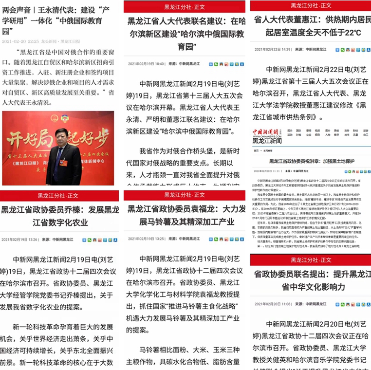 由省人大代表、校党委书记王永清牵头,组织学校人大代表、政协委员及相关专家学者开展深入调查研究,提交了《关于在哈尔滨新区建设全国首家“中俄国际教育园”的建议》联名建议,建议哈新区牵头,采用“新区搭台、高校主体、中俄协作、官民共举”的模式建设全国首家实体集群形态的“中俄国际教育园”,在会议期间得到多家媒体关注并予以宣传报道。王永清书记在接受媒体采访时表示,希望通过“中俄国际教育园”的建立,打造国家级中俄教育合作新高地和中俄国际产教融合新样板,助力我省“十四五”期间“建成国家向北开放重要窗口和东北亚地区合作中心枢纽”的目标,以此实现服务新时代中俄全面战略协作伙伴关系的新突破。同时,黑龙江大学将发挥建校80年来雄厚的俄语资源优势,助力涉俄项目资源的整合与对俄高端复合型人才的培养输送。