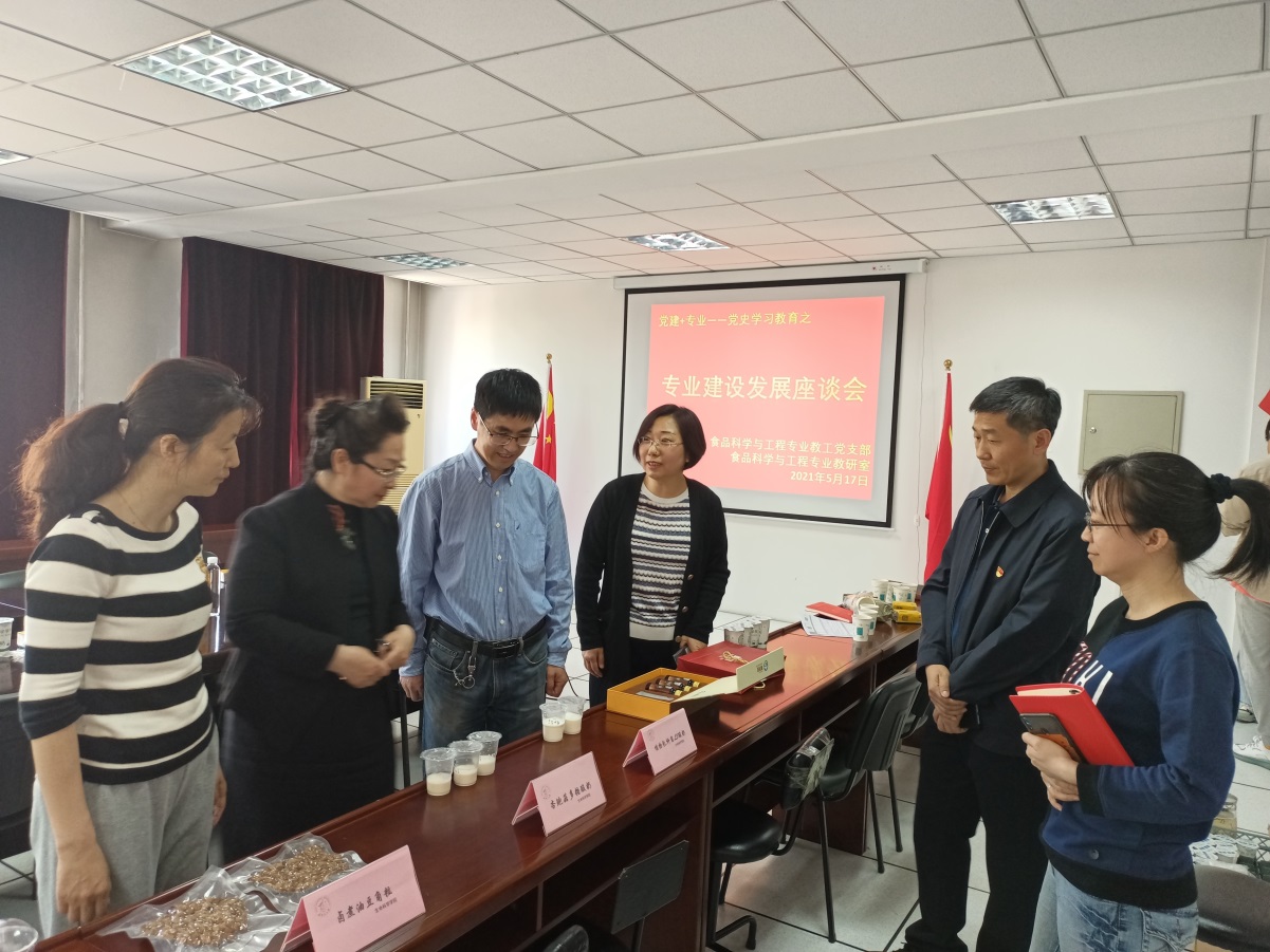 会上,专业负责人孟利向与会人员展示了生命科学学院现酿酸奶、美苏紫苏口服液、卤煮油豆角粒、短双歧杆菌微胶囊酸奶片、沙棘饮品等食品科学与工程专业的特色产品,介绍了食品科学与工程的食品营养工程、食品生物工程的特色教学模块。