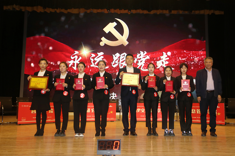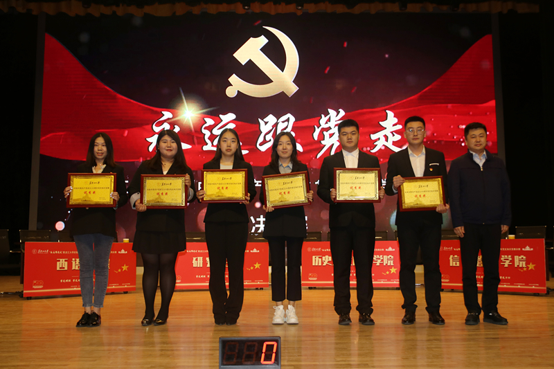 本次比赛内容丰富,涉及党的发展历程、党的理论知识、党的方针政策等多个方面,决赛通过必答题、抢答题和风险题三种形式进行。通过一个小时的激烈角逐,政府管理学院荣获一等奖,研究生院、信息管理学院荣获二等奖,西语学院、历史文化旅游学院、哲学学院获得三等奖,经济与工商管理学院等6个学院荣获优秀奖,与会领导分别为获奖学院颁奖。比赛最后,全场师生深情高唱《没有共产党就没有新中国》,表达黑大师生的爱党爱国热情和对祖国母亲的美好祝福。