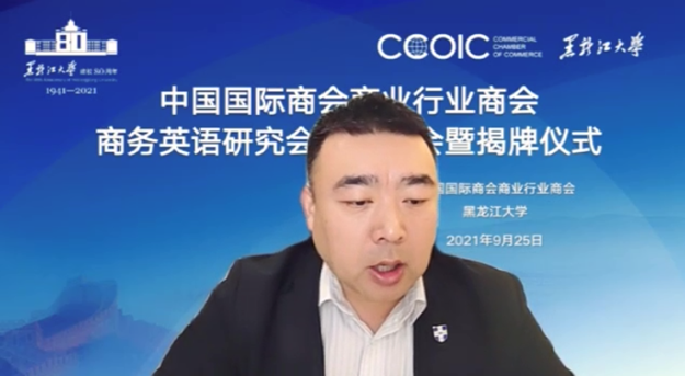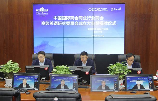 9月25日上午,中国国际商会商业行业商会商务英语研究委员会成立大会暨揭牌仪式在黑龙江大学成功召开。根据疫情防控要求,本次会议采用线上线下相结合的方式,主会场设在黑龙江大学模拟联合国会议室,线上会场采用网络直播形式。中国国际商会商业行业商会会长曾亚非、秘书长姚歆,我校副校长严明、副校长钟卫东以及对外经济贸易大学、上海对外经贸大学、上海交通大学及山东财经大学等30余所高校代表参加本次会议。