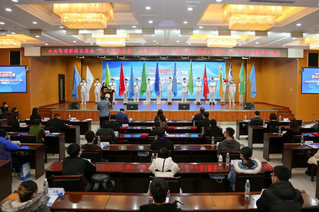 12月21日,黑龙江大学“中央专项彩票公益金宏志助航计划”全国高校毕业生就业能力培训基地揭牌暨开班仪式主会场在黑龙江大学主楼报告厅举行,会议同时以线上方式直播。省教育厅学生处二级调研员崔志伟,省大学生就业创业指导中心副主任刘鸿宇、我校党委副书记丁宏、招生就业指导中心全体工作人员、授课教师、班主任和参训学员代表和线上哈尔滨工程大学、东北林业大学、东北农业大学等14所高校就业部门领导及学员370人参加开班仪式。仪式由校招生就业指导中心主任陈宝凤主持。