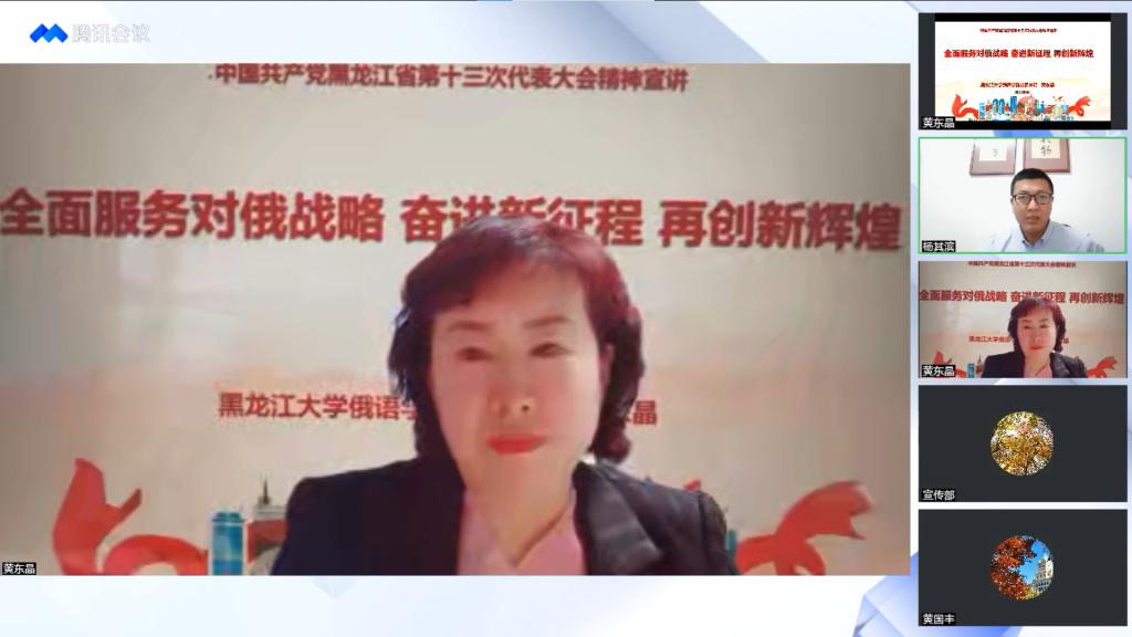 会上,黑龙江省第十三次党代会代表、我校俄语学院党委书记黄东晶以《全面服务对俄战略 奋进新征程 再创新辉煌》为主题,重点从“省第十三次党代会的召开情况”“省第十三次党代会报告的主要内容”“我校对俄办学如何落实省第十三次党代会精神”三个方面进行阐述。黄东晶书记分析了我校全面对俄办学的区位优势、传统优势、学科优势、规模优势和结构优势,介绍了我校俄语学院、中俄学院、俄罗斯语言文学与文化研究中心在人才培养、科研与学科建设、文化传承与服务、国际交流等方面取得的重要成果。她表示,学校俄语办学要依照实际情况,做好顶层设计;要夯实专业内功,守住自身优势特色;要整合对俄资源,站在时代前沿;要加强内外联动,持续提升学校对俄办学特色的社会影响力。她坚信我校俄语办学在黑龙江省委和学校党委的正确引导下,将为我省的全方位发展做出更大的贡献,以优异成绩迎接党的二十大胜利召开。