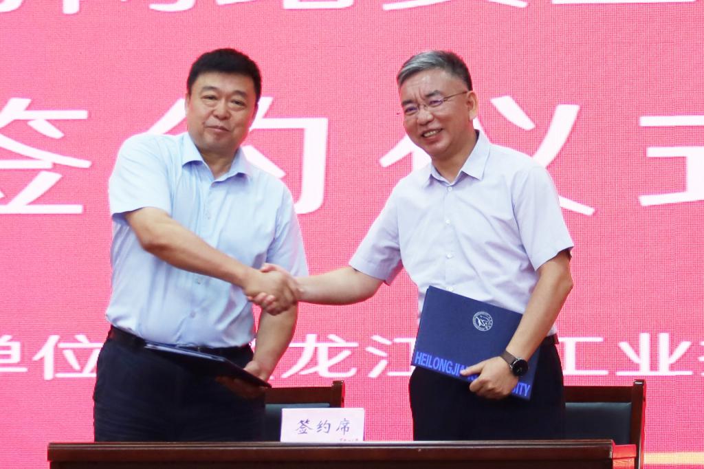 黑龙江大学密码与网络安全研究院院长唐孝敏与黑龙江航天信息有限公司总经理任海鹏签署共建协议。