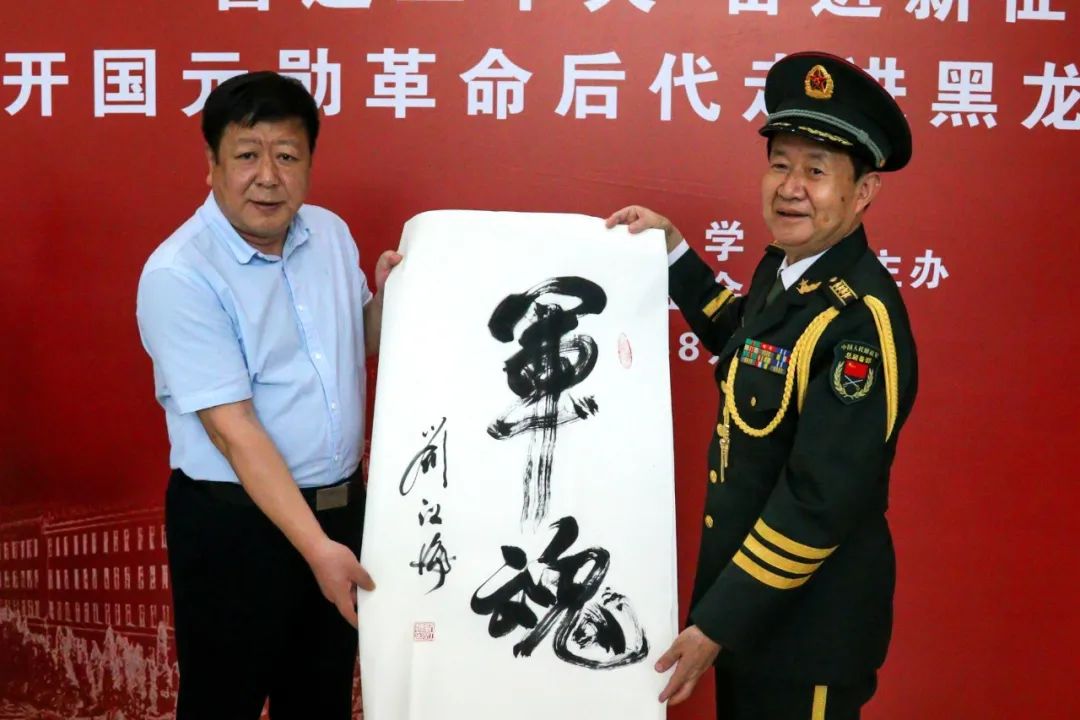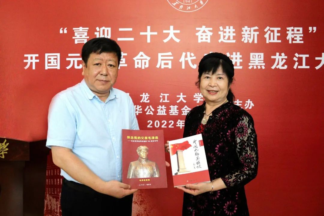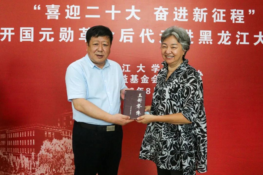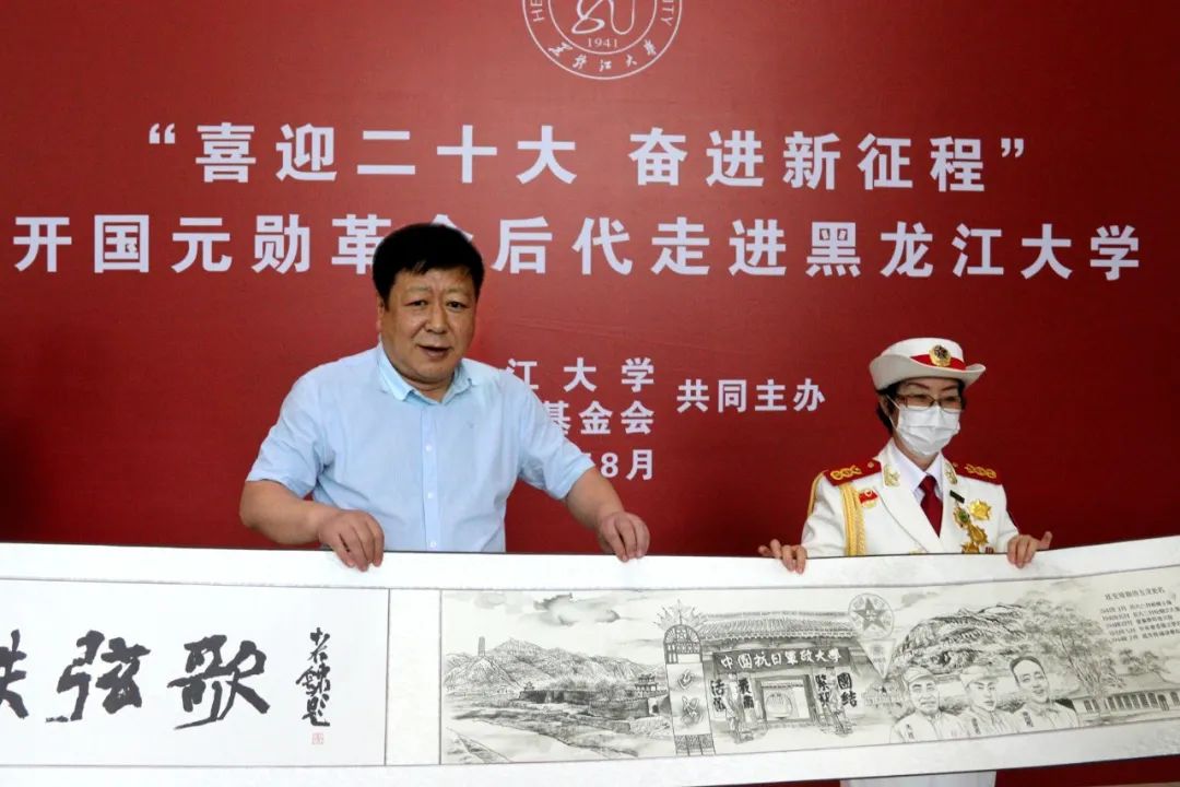 王永清书记代表学校向东北抗联、东北野战军后代,景华公益基金会会长张景华女士赠送“八秩弦歌”黑龙江大学80周年校庆历史长卷。