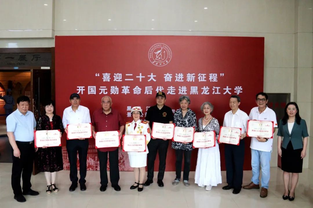 王永清书记代表学校为毛小青女士、刘武先生、王宇红女士、刘煜滨先生、刘晓春女士、张景华女士、于培顺先生、严浩先生、姜铁斌先生等人颁发“黑龙江大学红色宣讲员”聘书。