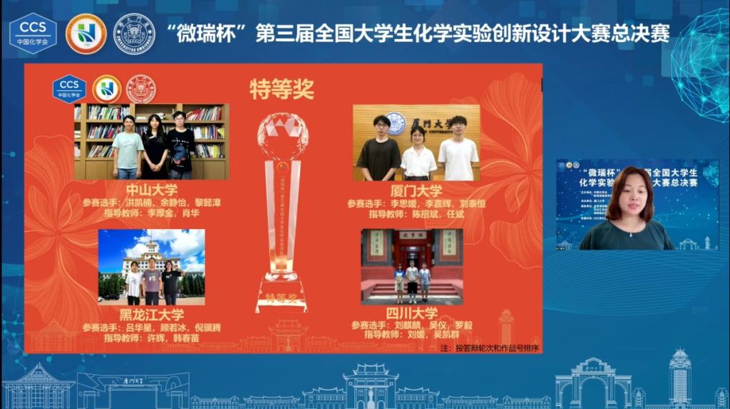 8月21日-24日,第三届“微瑞杯”全国大学生化学实验创新设计全国总决赛在厦门大学落下帷幕。我校化学化工与材料学院本科生吕华星、顾若冰、倪骥腾组成的“若星辰”代表队(指导教师:许辉、韩春苗),凭借参赛项目《1,2-二咔唑基-4-溴苯的合成及长余辉性质表征》在众多高水平院校队伍中脱颖而出,荣获全国特等奖,创我校在此项赛事的历史性最好成绩。