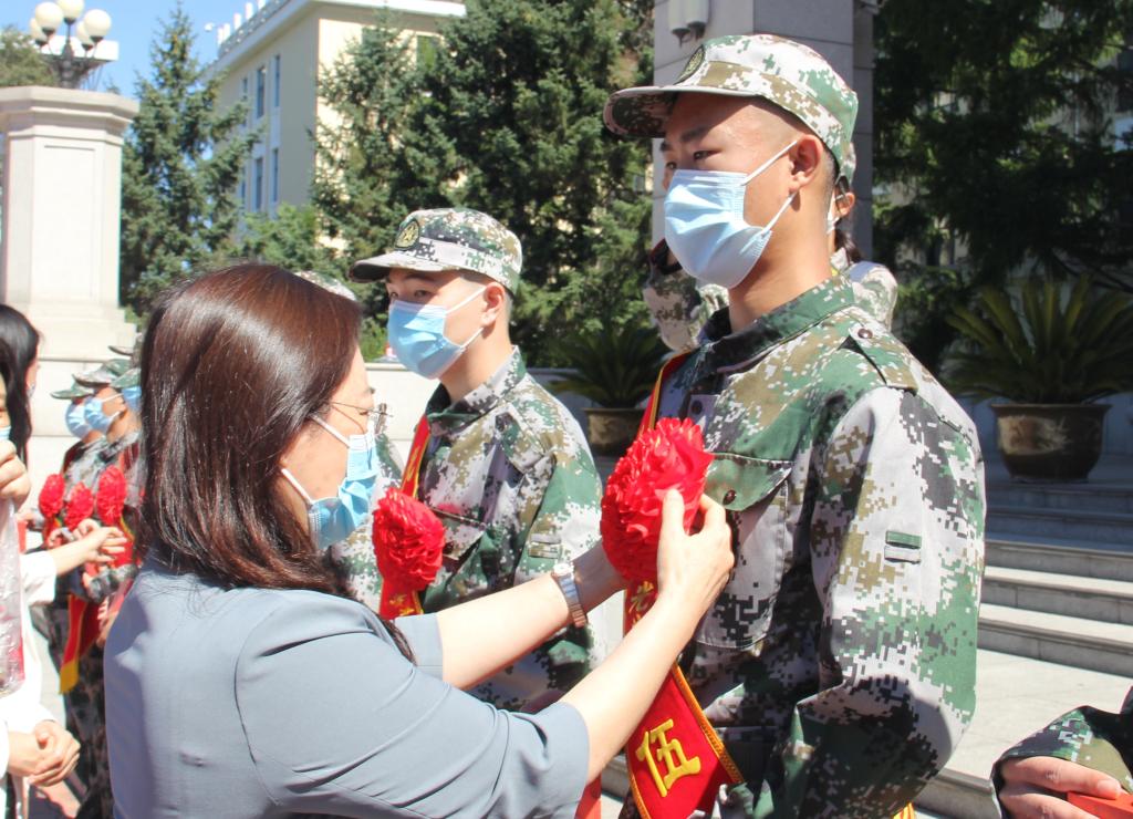 9月1日上午,学校派校车送新兵入营集训之际,校党委副书记丁宏等领导、老师到主楼广场欢送新兵代表离校入营,为新兵代表佩戴“光荣入伍”大红花、送上校庆纪念徽章,并与全体入伍新兵合影留念。