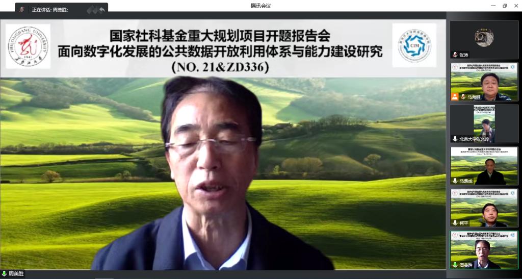 周美胜在致辞中首先感谢了与会的各位专家学者多年来对黑龙江省哲学社会科学事业发展的大力支持,肯定了项目选题的前瞻性、论证的科学性、观点的创新性。他强调,“面向数字化发展的公共数据开放利用体系与能力建设研究”项目的开展,一是要坚持辩证唯物主义和历史唯物主义世界观、方法论,坚持马克思主义在社会科学领域的指导地位,以此来指导我们的研究工作;二是要坚持严谨的学风,强化公共数据开放利用的数字环境分析和系统生态建设,既要构建可持续安全可靠、高效高质量的公共数据开放利用体系,也要注意课题相关组织的科学性和严谨性;三是要注重学习成果的创新性、时代性,强调多学科通力合作,提高信息化数据开发的效率,增强科技服务能力;四是要讲究效率与成果的统一,黑龙江大学作为项目的责任单位,必须要给予高度重视,加强项目全流程监督管理,确保项目顺利开题,并能保质保量按时完成。省哲学社会科学工作办将全力支持、全程服务、全程跟踪推动该项目研究任务圆满完成。