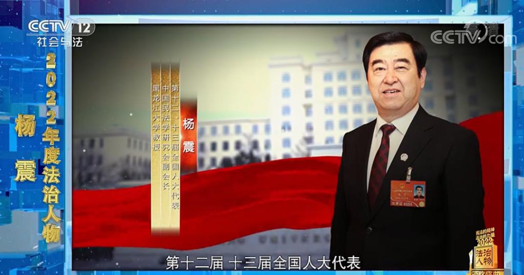 12月10日,由司法部、全国普法办公室联合中央广播电视总台共同主办,社教节目中心承办的特别节目《宪法的精神 法治的力量——2022年度法治人物颁奖盛典》在央视社会与法频道(CCTV-12)播出,第十二届、第十三届全国人大代表,中国民法研究会副会长,中国法学会民法典编纂项目领导小组成员,黑龙江大学法学教授杨震从29名入围者(群体)当中脱颖而出获“2022年度法治人物”荣誉称号。