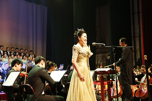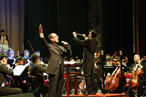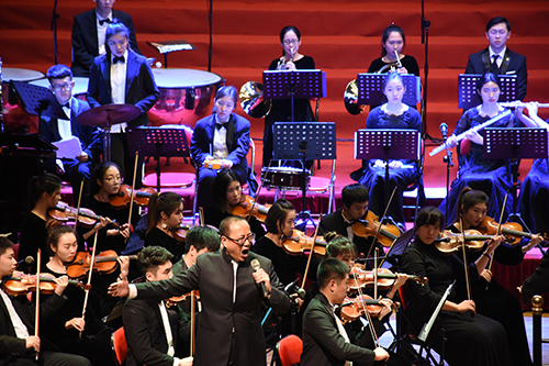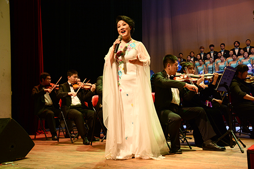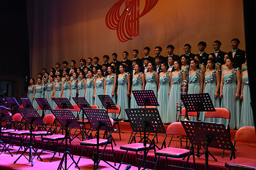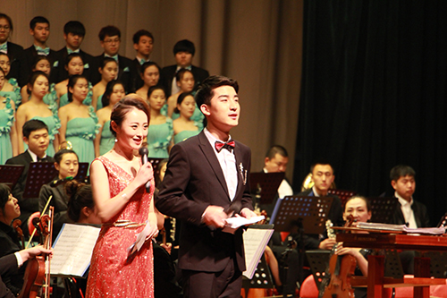 男中音独唱《为你歌唱》和女高音独唱《江山》在艺术学院交响乐团的伴奏下,以高亢的曲调祝福祖国繁荣昌盛。“我是你昨天的记忆如歌,我是你明天的锦绣如画。”校歌《岁月如歌》回荡耳畔,台上台下齐声合唱,激发了师生们的爱校情怀。
