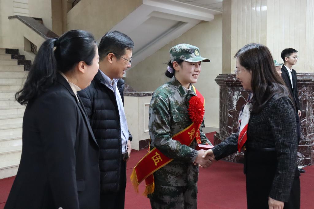 丁宏在讲话中指出,黑龙江大学2023年春季征兵工作“开门红”,女兵应征入伍体检、政考“双合格”人数再创新高,位居全省前列。她衷心祝贺同学们通过层层选拔成为预定新兵,为各位同学积极响应国家号召,携笔从戎,保家卫国,绽放青春的实际行动点赞。同时对全体预定新兵提出三点希望:一是要提高政治站位,不忘初心使命。坚定拥护“两个确立”,增强“四个意识”、坚定“四个自信”、做到“两个维护”。要求同学们在军营中历练成长,要把责任扛在肩上、把荣誉放置心中,用实际行动保卫祖国的繁荣与安宁。二是要磨炼顽强意志,锤炼过硬本领。要求同学们珍惜军旅生涯,不怕苦累,认真训练,锻炼自己坚强的意志品质、过硬的军事素质,安心服役,争做新时代优秀军人。希望同学们尽快适应新环境,不断提高政治觉悟,努力练就过硬本领,把自身发展融入强国强军的伟大实践,以实际行动擦亮青春底色。三是要传承母校精神,彰显黑大风采。学校永远是学生最坚强的后盾、最温暖的港湾。母校会坚持做好应征入伍学生服务保障工作。她表示在条件允许的情况下,学校和学院的领导、老师会深入军营为入伍大学生士兵送去母校的关怀和慰问。同时,她希望同学们把“志存高远,爱国奉献,艰苦奋斗,自强不息”的黑大精神带到部队,让黑大精神在军营里闪光,为母校增光添彩!