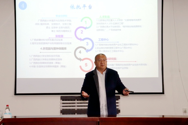 广西民族大学海洋与生物技术学院院长姜明国教授介绍广西分中心的发展情况。他表示,依托分中心的建设,整合分中心和其它资源共建了产业研究院等平台,完成了一系列的标志性成果转化和标志性合作共建。