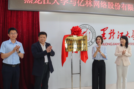 王永清书记与于文秀副校长、盛黎明副院长、孙甲子董事长共同为“黑大亿林网络空间安全产业技术研究中心”成立揭牌。