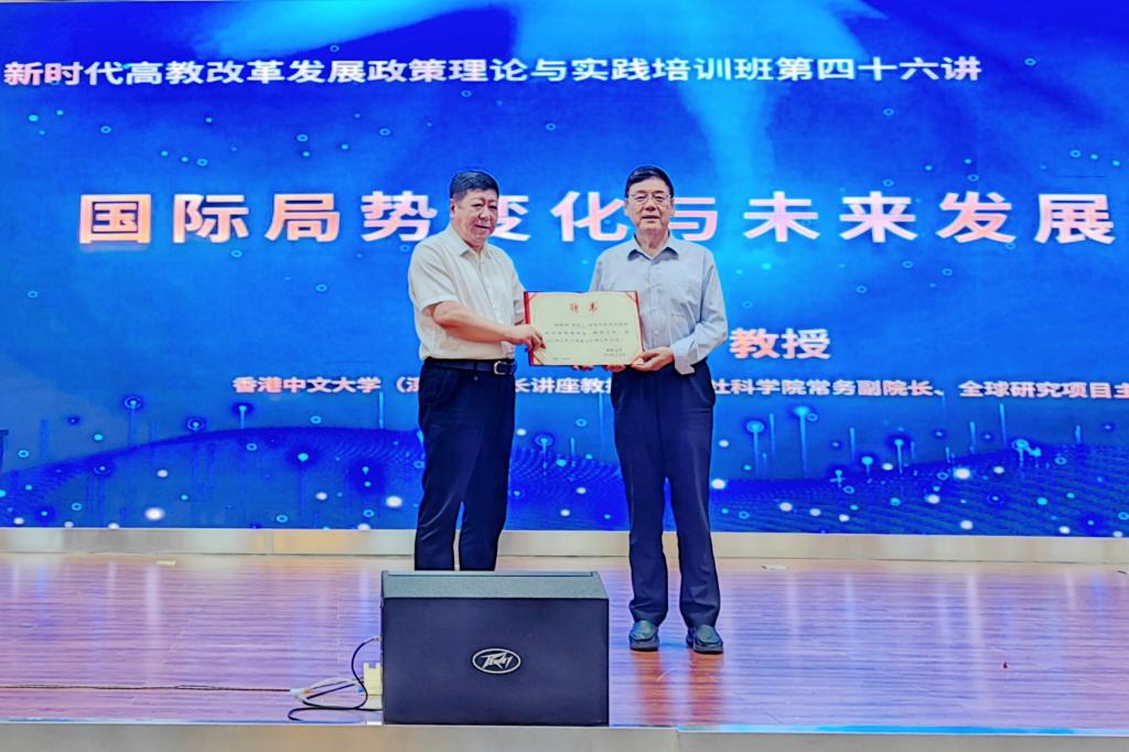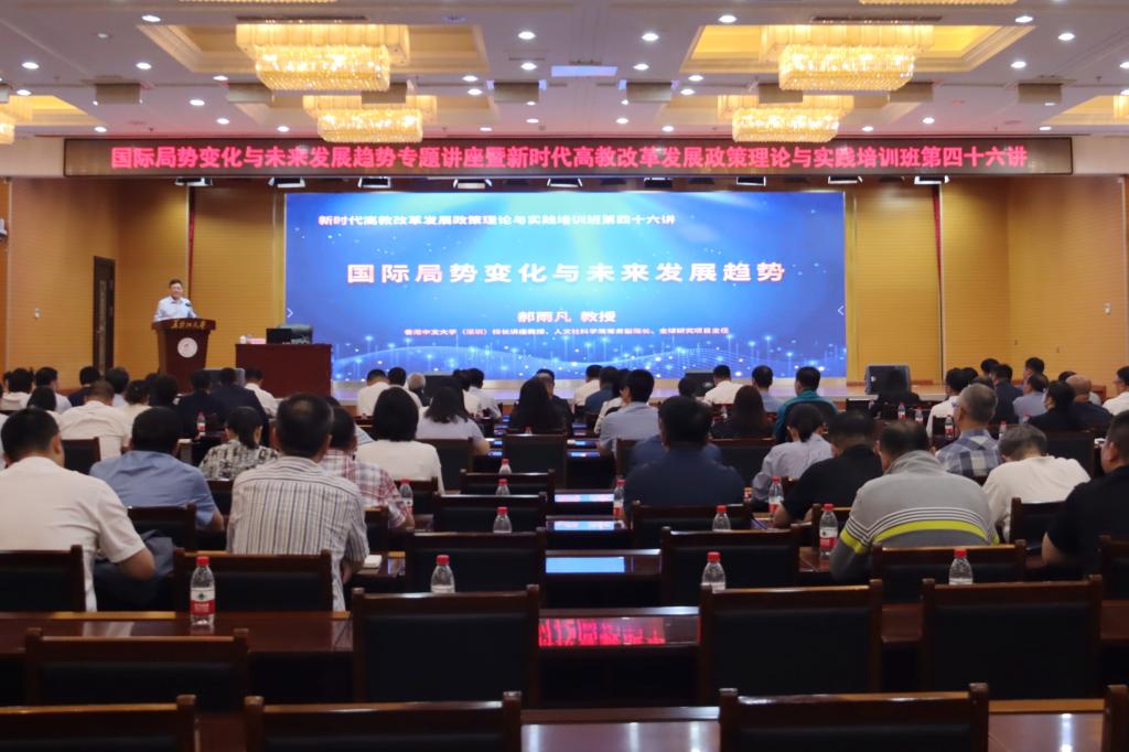 为推动主题教育走深走实,教育引导广大党员干部深刻感悟党的创新理论的实践能力。按照学校主题教育工作安排,6月20日下午,我校在主楼一楼报告厅举办国际局势变化与未来发展趋势暨新时代高教改革发展政策理论与实践培训班第四十六讲。香港中文大学(深圳)校长讲座教授、人文社科学院常务副院长郝雨凡担任本次专题讲座的主讲人。副校长李卓主持活动。