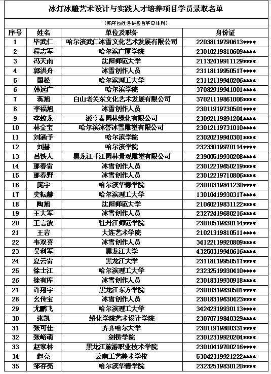 经过长达三个月的招生工作,来自全国各地的冰灯冰雕从业者、爱好者及高校师生踊跃报名,经初步审查符合条件的报名者近50余人。按照国家艺术基金“冰灯冰雕艺术设计与实践人才培养”项目学员名额为35人的限定,2016年10月22日在黑龙江大学艺术学院召开了复评大会,会议聘请行内专家朱晓东、纪连路、余雁、张红风四位导师担任审核委员,他们根据遴选条例的规定进行盲审,对每一位报名者的雕刻作品、参与项目、获奖情况等进行了详细严谨鉴定,为每位报名者的冰灯冰雕技艺、获奖和项目得分进行综合评定和现场打分,再与初评中报名者的相关成就得分相加进行排名,评审过程公开、公平、公正。最后遴选确定35位培养项目学员,现予以公布。