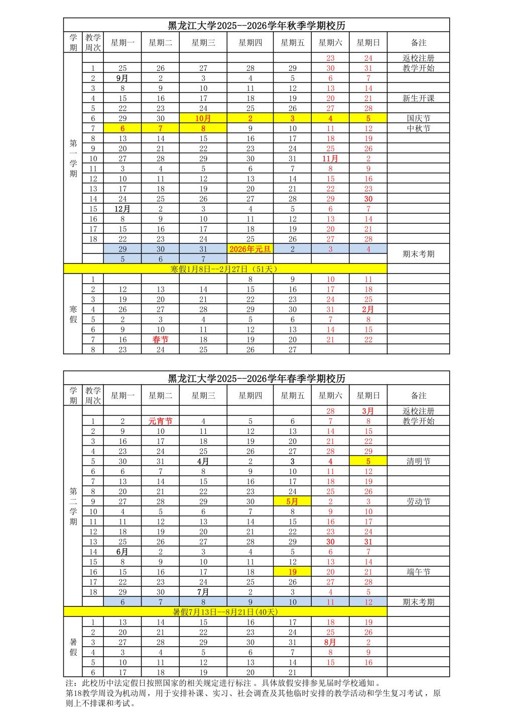 黑龙江大学2025-2026学年校历