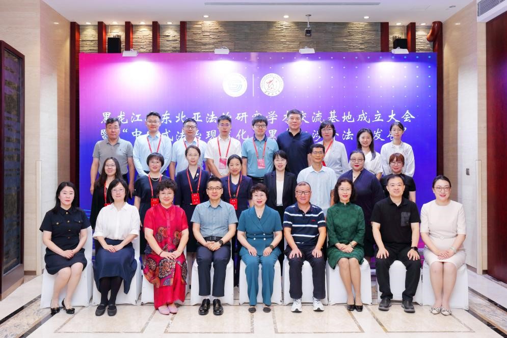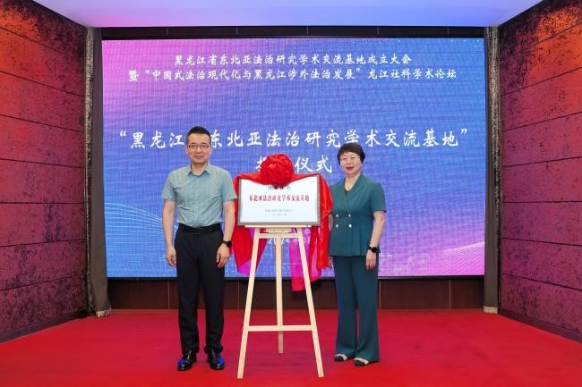 黑龙江大学校长王敬波、黑龙江省社科联副主席王宏宇为“黑龙江省东北亚法治研究学术交流基地”揭牌。