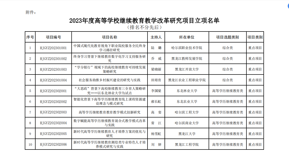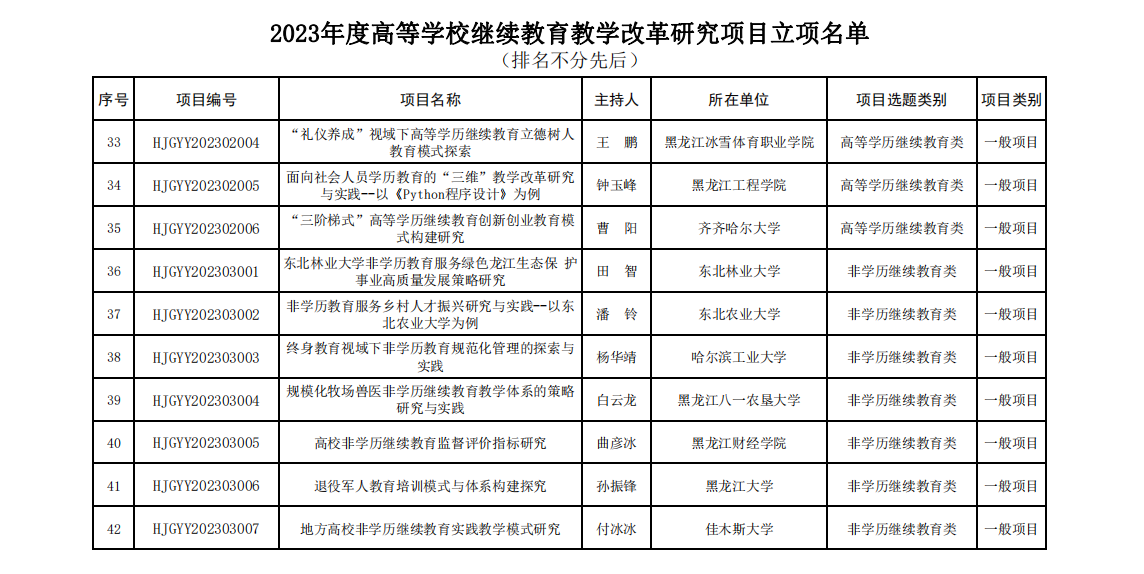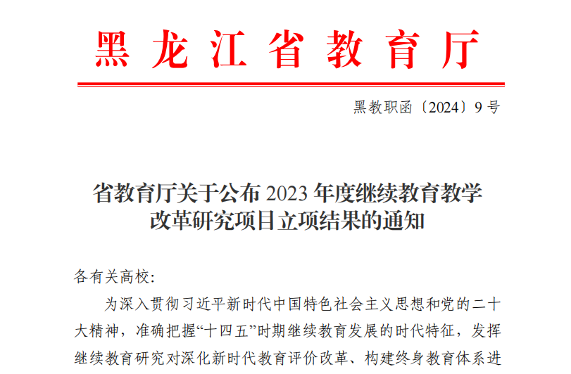 为深入贯彻习近平新时代中国特色社会主义思想和党的二十大精神,贯彻落实全国和全省教育大会精神,落实立德树人根本任务,发挥教育教学改革研究的探索性、先导性作用,切实推动我省继续教育高质量发展,黑龙江省教育厅开展了2023年度高等学校继续教育教学改革研究项目申报。我校继续教育学院获得1项重点项目、1项一般项目立项。