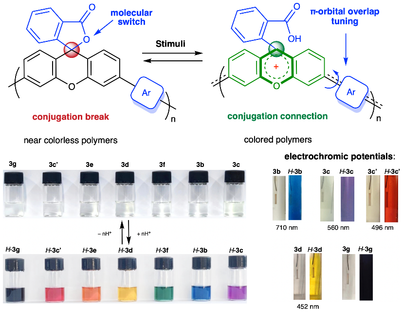 图1. 所提出的高分子结构具备在外部刺激下实现共轭可逆调控的能力,并展示了该类材料在酸碱或电刺激作用下,通过共轭调控实现可逆变色的性能。