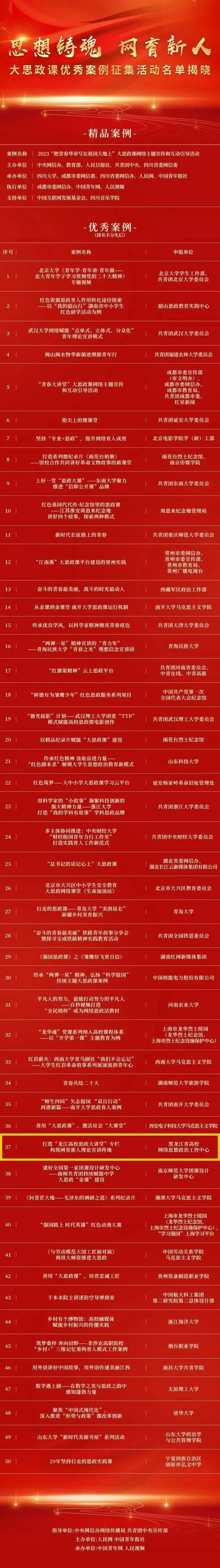 近日,由中央网信办网络传播局、共青团中央宣传部指导,人民网、中国青年报社共同主办的“思想铸魂 网育新人”大思政课优秀案例征集活动评选结果揭晓,经初选、终选以及结果公示,产生精品案例1件、优秀案例50件。黑龙江省高校网络思想政治工作中心(黑龙江大学)申报的《打造“龙江高校思政大讲堂”专栏 构筑网育新人理论宣讲阵地》获评优秀案例,是黑龙江省唯一入选的大思政课优秀案例。