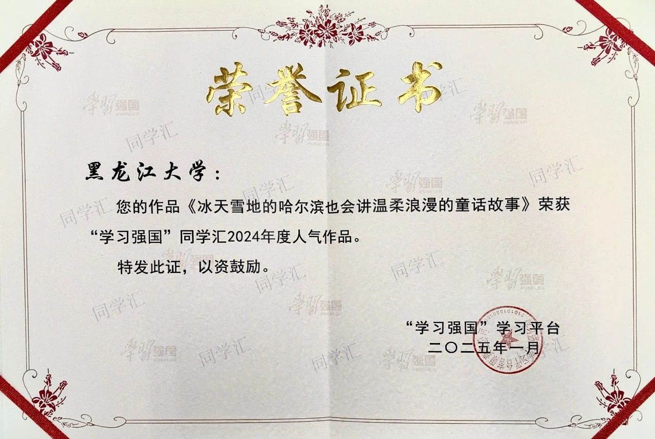近日,“学习强国”学习平台公布了“学习强国”同学汇2024年度人气作品(高校)Top100、2024年度人气作品(个人)Top100、2024年度高校融媒团队Top50名单。我校被评为2024年度“学习强国”同学汇最具传播力高校,我校全媒体中心被评为2024年度高校融媒团队Top50,《冰天雪地的哈尔滨也会讲温柔浪漫的童话故事》荣获“学习强国”同学汇2024年度人气作品。