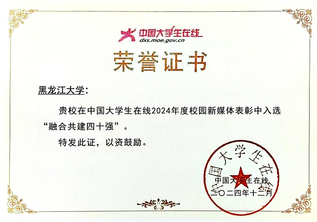 本次研讨会上,还对2024年中国大学生在线校园优秀网络通讯站、优秀新媒体共建高校进行了表彰。黑龙江大学荣获中国大学生在线2024年度校园新媒体融合共建四十强、黑龙江省高校网络思想政治工作中心荣获中国大学生在线2024年度校园新媒体优秀合作伙伴,党委宣传部肖博宇同志获评校园新媒体优秀指导教师。黑龙江大学获评优秀校网通站,《点亮青春,成长陪伴,祝小中20岁生日快乐!》入选年度优秀内容榜单,党委宣传部肖博宇同志获评校网通优秀指导教师、校园行活动优秀指导教师,新闻传播学院陈书洋获评校网通优秀编辑,黑龙江大学党委宣传部获评校园行活动优秀组织单位。(党委宣传部供稿)