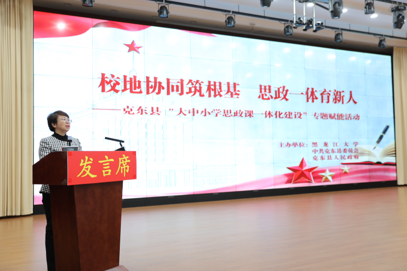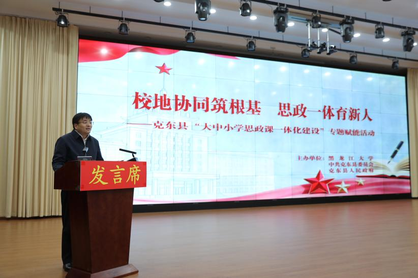 王敬波在致辞中表示,黑龙江大学始终坚持扎根龙江大地办教育,并将“大中小学思政一体化建设”列为校地合作重点议题。她指出,县域是教育承上启下的关键环节,克东县展现出的积极性与前瞻性,为双方合作奠定了良好基础。学校将充分发挥马克思主义理论学科优势和教育教学资源,与克东县携手,在资源共享、师资共育、课程共创等方面深化合作,共同探索思政课一体化建设有效路径,打造可复制、可推广的县域实践样板。