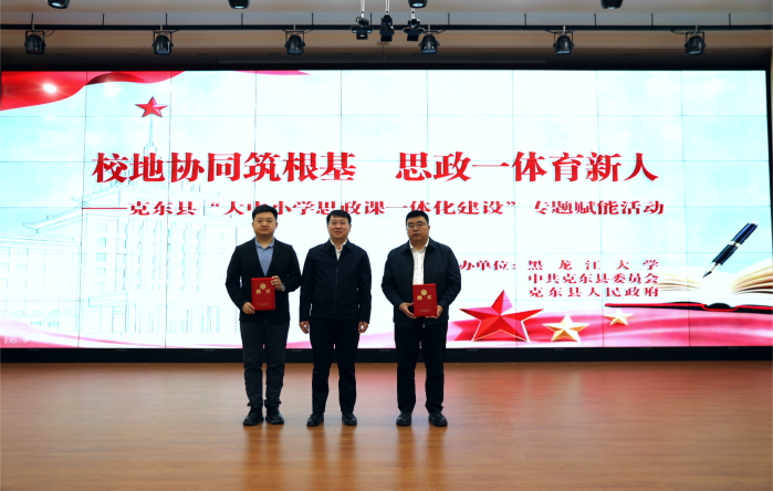 在签约仪式上,王秋与克东县第一中学、第二中学、实验小学共同签署了《大中小学思政课一体化建设合作协议》,双方将在思政课教学、师资队伍建设、教学资源开发等方面开展深度合作。克东县县长许晓飞为王秋、刘炳序颁发“克东县思政教育顾问”聘书。