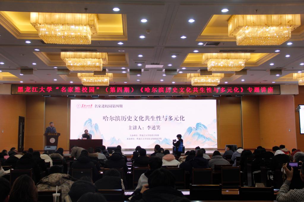 12月12日晚,我校在主楼一楼报告厅举办“名家进校园”第四期《哈尔滨历史文化共生性与多元性》专题讲座,由李述笑担任主讲人。哈尔滨市文物馆馆长杨伟东,校宣传部、历史文化旅游学院及艺术学院师生代表讲座。讲座由党委常委、宣传部部长杨其滨主持。