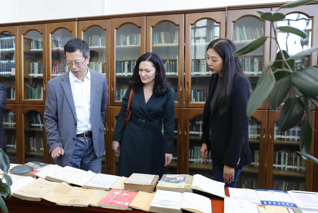 代表团一行参观了我校俄语学科成果展、俄语学院资料中心。俄语学院院长孙超向代表团一行简要介绍了我校俄语学院学科建设成果及俄文图书文献资料。