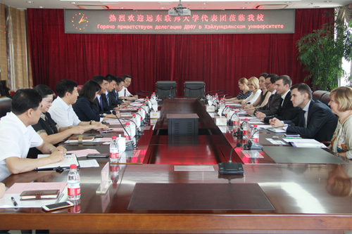 6月14日下午,俄罗斯远东联邦大学代表团在代理校长N.Y.阿尼西莫夫的带领下来我校参观访问。代表团首先在严明副校长的陪同下参观了校史馆,随后双方在主楼八楼会议室就如何加强合作举行了会谈。参加会谈的有我校党委书记刘德权、副校长严明,以及国际合作与交流处、研究生学院、俄罗斯语言文学与文化研究中心、中俄学院、教务处、俄语学院的主要领导。