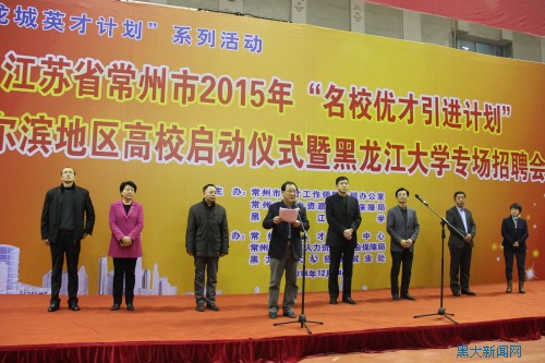 12月24日上午,常州市2015年“名校优才引进计划”哈尔滨地区高校启动仪式暨黑龙江大学专场招聘会在我校体育馆举行,拉开了常州市在哈尔滨大规模引进2015届优秀高校毕业生的序幕。黑龙江省教育厅学生信息咨询与就业指导中心副主任郭承哲,我校党委副书记曲科军,中共常州市委组织部副部长、市编办主任杨琪,常州市钟楼区人民政府副区长张菁,常州市人力资源和社会保障局副局长程沫芝出席了本次启动仪式。