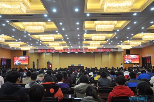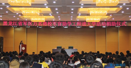 11月5日下午,黑龙江省军区“万名将校军官助学工程进大学”活动捐助仪式在我校主楼一楼报告厅举行,省军区募集善款20万元资助来自黑龙江大学、哈尔滨工程大学的100名寒门学子。