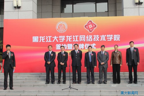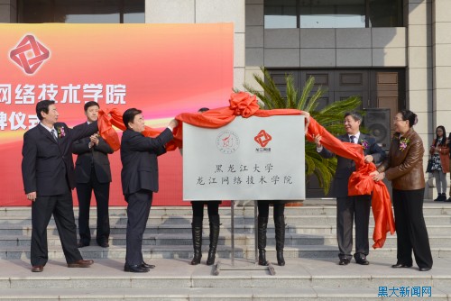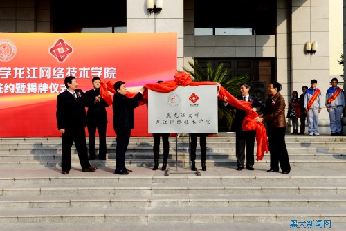 10月10日下午2时,我校与黑龙江广播电视网络股份有限公司合作成立龙江网络技术学院揭牌仪式在主楼广场举行。省政府副秘书长王国才,省委宣传部副部长赵德信,省广电局副局长樊占盛,我校校长何颖、党委副书记曲科军,黑龙江广播电视网络股份有限公司董事长李锡文,龙江网络公司和我校相关部门领导及师生代表参加了揭牌仪式。新华社、《光明日报》、中国教育电视台、黑龙江电视台、《黑龙江日报》、东北网等多家媒体对此次活动进行报道。