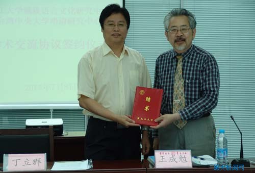 在研讨会开幕式上,黑龙江大学满族语言文化研究中心与台湾中央大学明清研究中心签署了学术交流协议。丁立群副校长代表学校向王成勉教授颁发黑龙江大学满族语言文化研究中心荣誉教授聘书,并表示,希望通过学术交流协议的签署,深入推动两校、两中心在学科建设、学术交流、人才培养、社会服务等领域的密切合作。