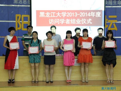 张颖春处长宣读了《关于准予韩颖梅等33名访问学者结业的决定》和《关于表彰黑龙江大学2013-2014年度优秀访问学者、优秀指导教师、优秀科研成果的决定》,与会领导为访问学者代表颁发了结业证书,并为获得表彰的个人颁发了荣誉证书。