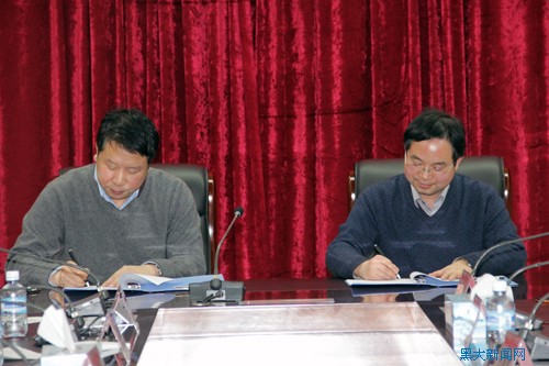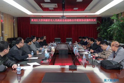 1月13日下午,黑龙江大学与新沂市人民政府全面战略合作框架协议签约仪式在主楼常委会议室举行。新沂市人民政府副市长张旭波,新沂经济开发区党工委副书记秦友山,无锡—新沂工业园管委会副主任吴雄刚,我校副校长付宏刚以及新沂市政府有关领导和工作人员,当地企业家代表,我校科技处、计算机科学技术学院、化学化工与材料学院、电子工程学院的主要负责同志出席仪式。仪式由我校科学技术处处长吕厚均主持。