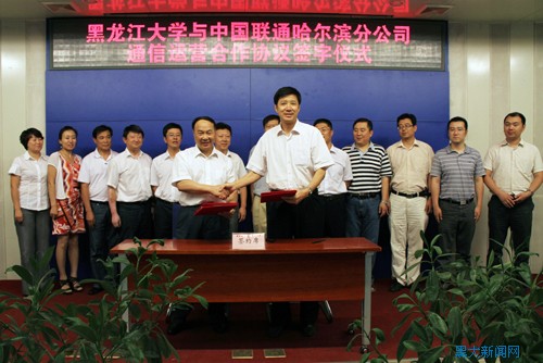 7月28日16时,“黑龙江大学与中国联合网络通信有限公司哈尔滨市分公司通信运营合作协议”签字仪式在我校260会议室举行。参加签字仪式的双方领导和代表有:我校党委副书记曲科军,学校办公室、财务处、国有资产管理处、信息与网络建设管理中心等部门负责人;中国联通哈分公司总经理孙静路、副总经理王文林、李广武,市场销售部、和兴电话局、校园管理中心、和兴校园营销中心等部门负责人。签字仪式由学校办公室主任陈文远主持。