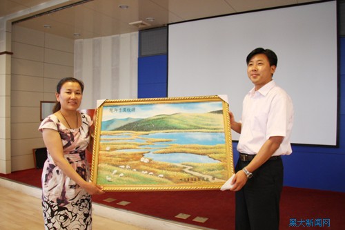 会谈在和谐、愉悦的氛围中进行。努尔马娜提团长把县人民政府的慰问信和录制着当地民歌的光碟交到清河学员手中。同时,她还代表清河县政府向我校赠送了礼品——一幅由当地特殊工艺制成的沙画《花海子夏牧场》,碧蓝的天、绿浪般的草场和自由驰骋的骏马,再现了一年中最美丽的清河风光和淳朴豪爽的哈萨克民风。