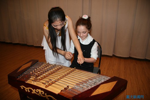 团员向俄罗斯小姑娘讲解扬琴并示范演奏